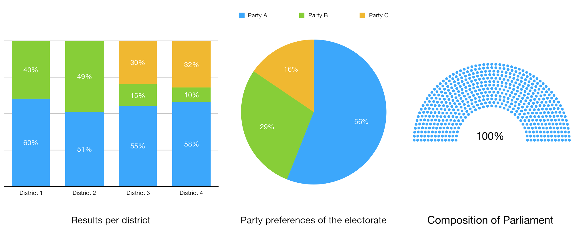 However, without proportionality, this would mean that Parliament would be composed entirely of members of Party A. When considering the overall party preferences of the electorate – where Party A “only” receives a 56% approval from the population – this poses a grave problem of representativeness and, therefore, of democracy. Parties B and C, while making up 44% of the overall population’s preferences would be absent from Parliament and would not provide a much-needed opposition.